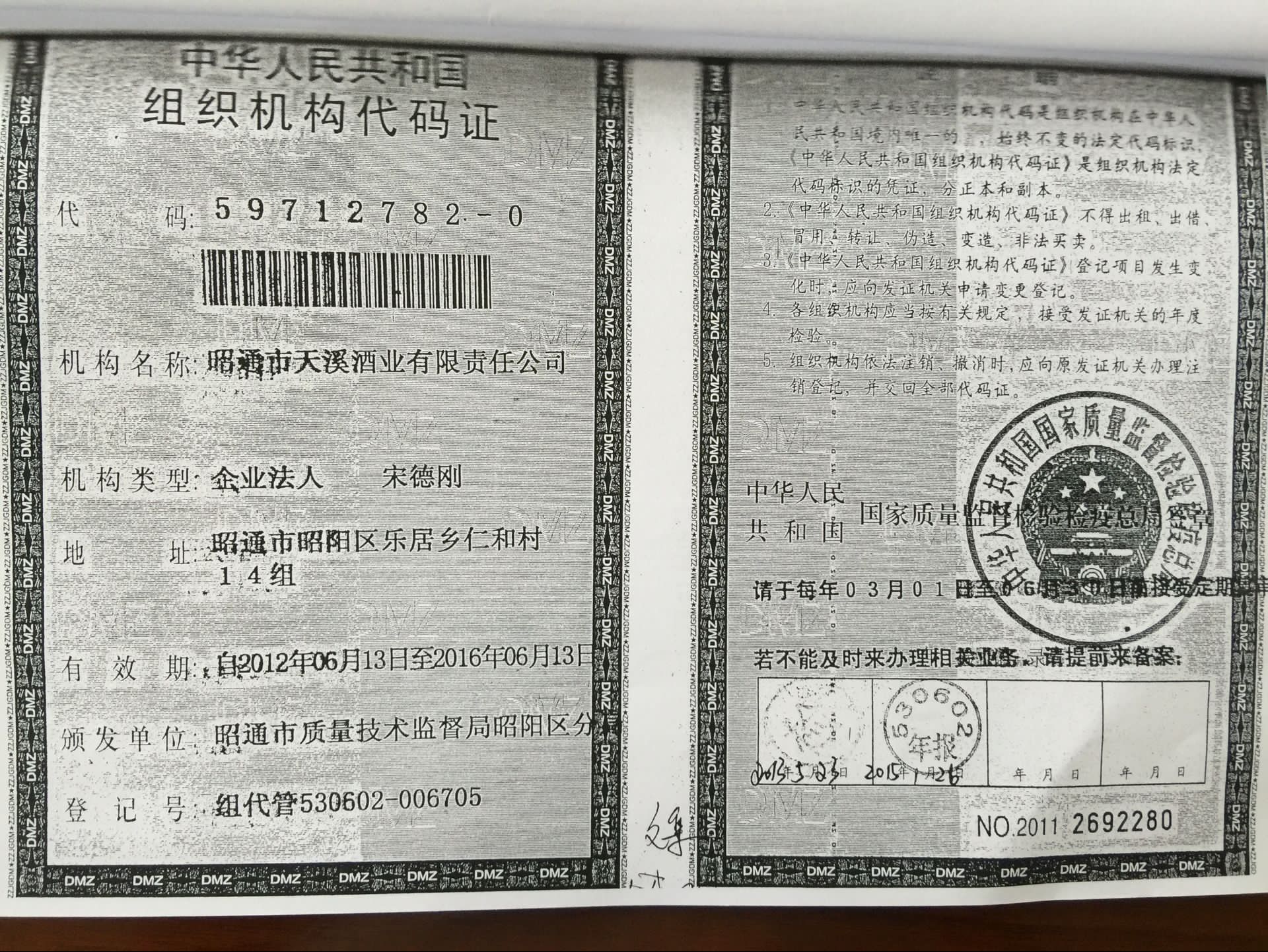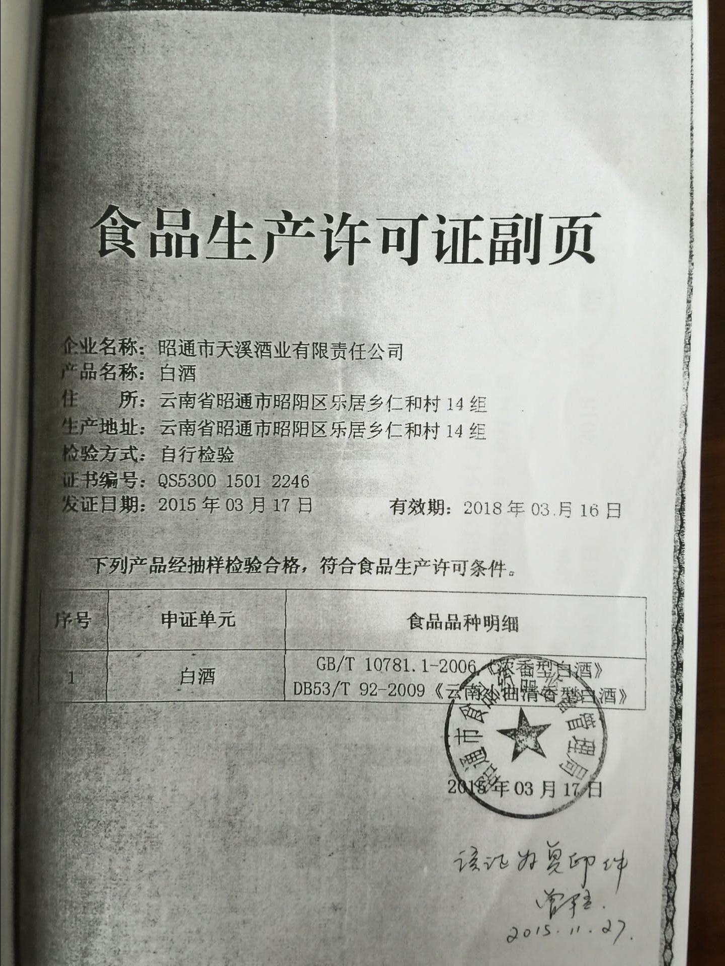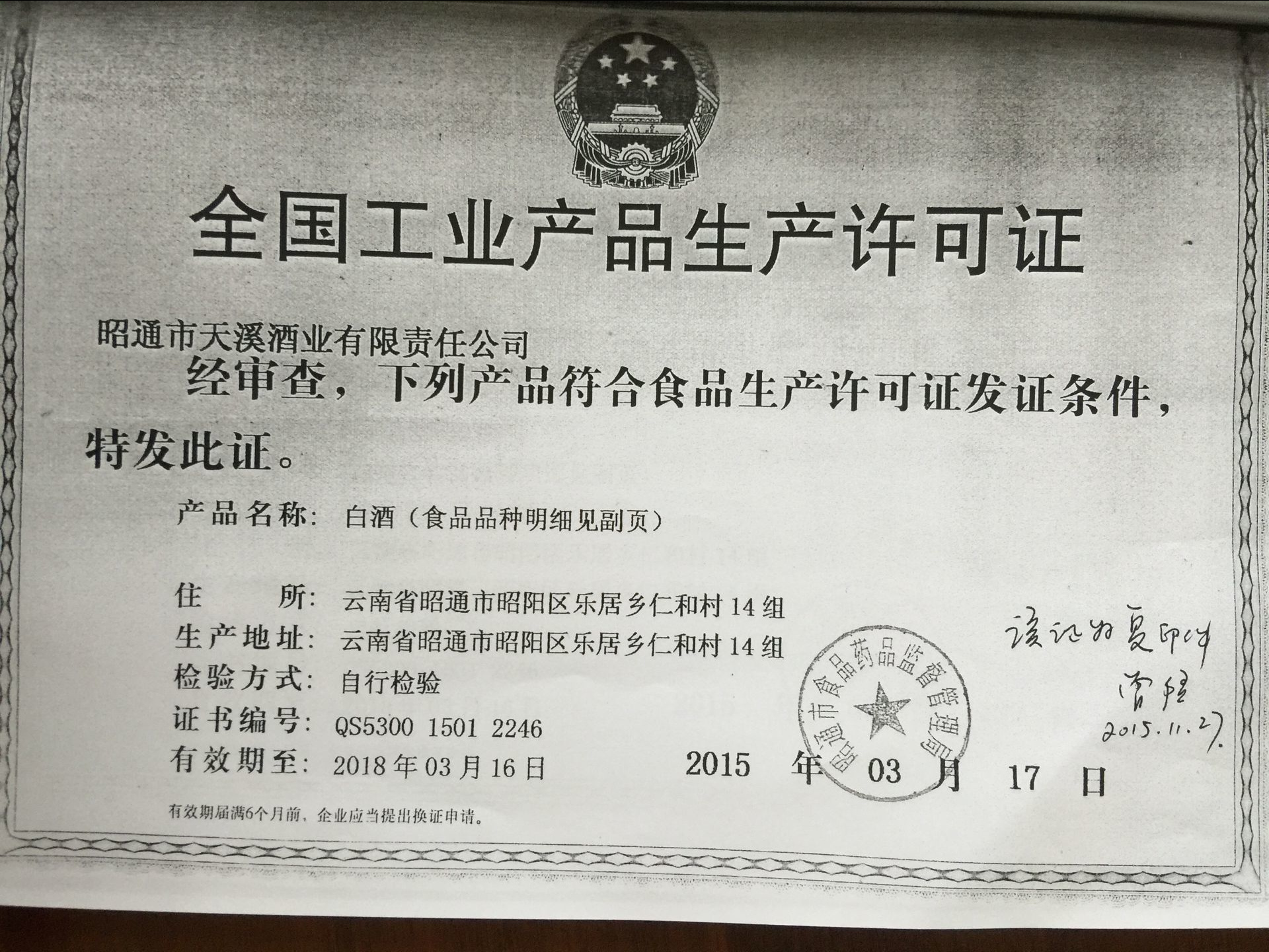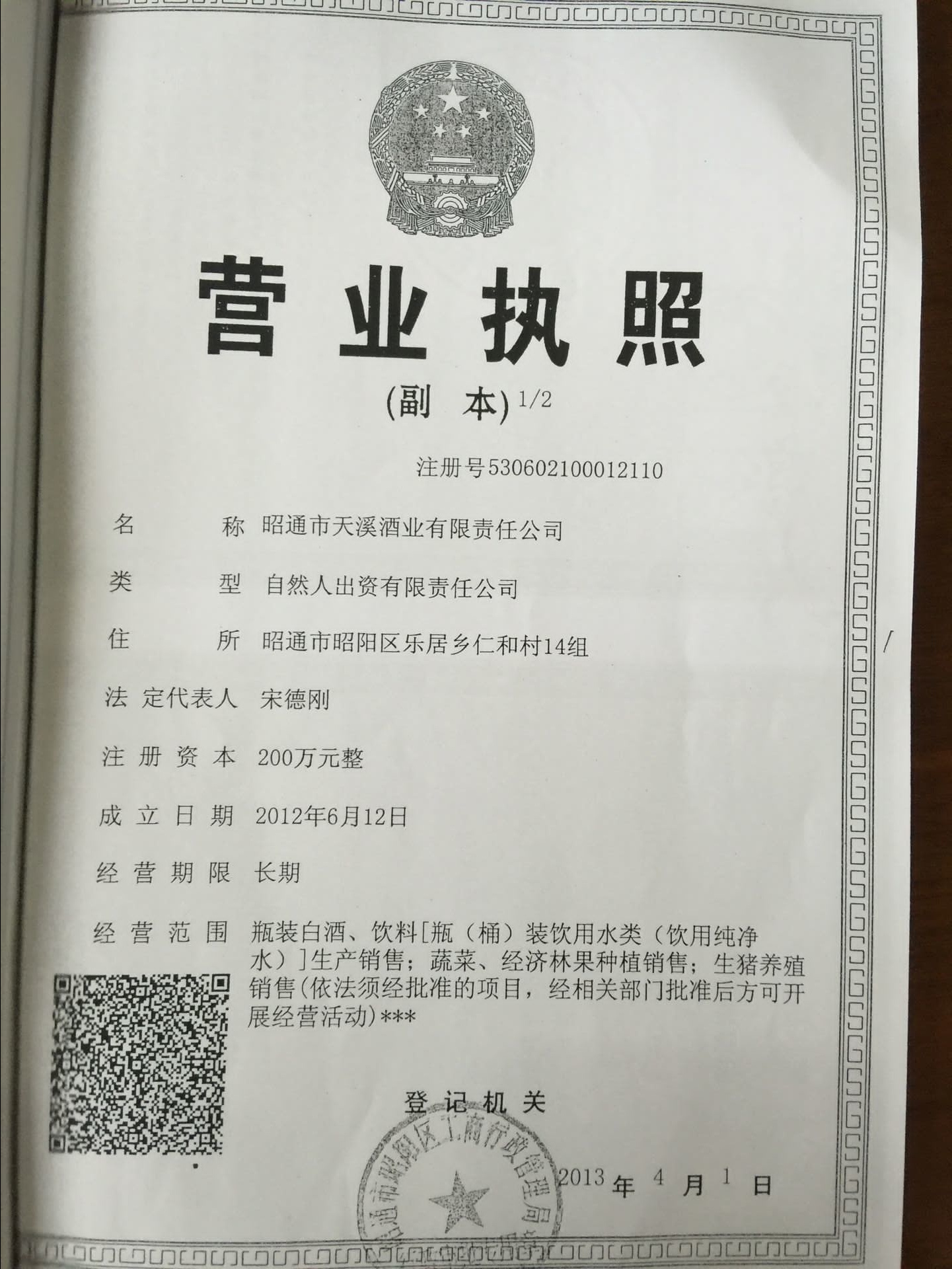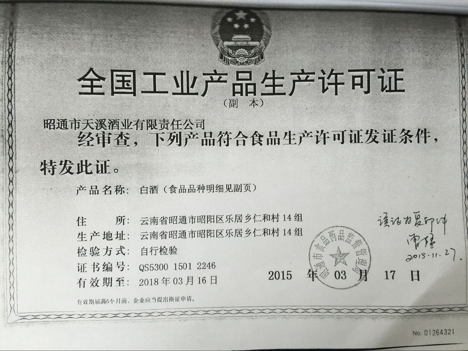 昭通市天溪酒業(yè)有限公司資質證照復印件