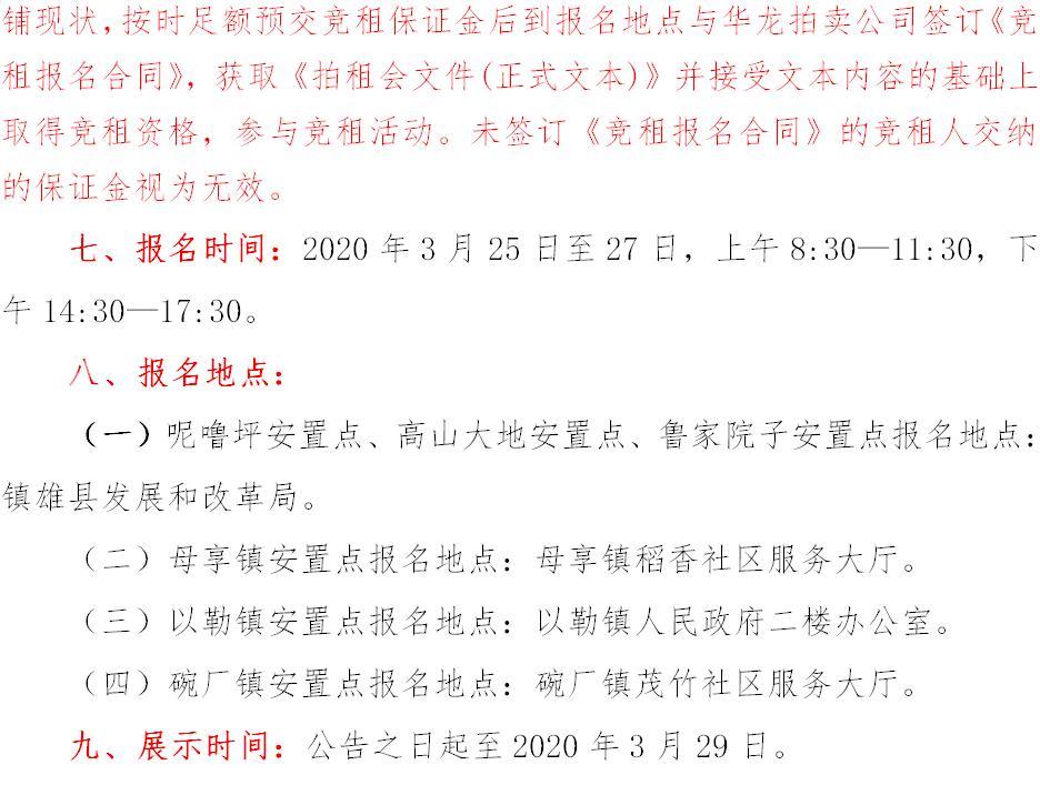 經(jīng)鎮(zhèn)雄縣人民政府批準(zhǔn),受相關(guān)部門(政府)委托,公開(kāi)拍租位于鎮(zhèn)雄縣易地扶貧搬遷工程呢嚕坪安置點(diǎn)7棟獨(dú)立商鋪使用權(quán)、高山大地安置點(diǎn)27間(棟)商鋪使用權(quán)、魯家院子安置點(diǎn)24間(棟)商鋪使用權(quán)、母享安置點(diǎn)146間商鋪使用權(quán)、以勒物流城安置點(diǎn)67間(棟)商鋪使用權(quán)、碗廠安置點(diǎn)114間商鋪使用權(quán)。相關(guān)事項(xiàng)如下: